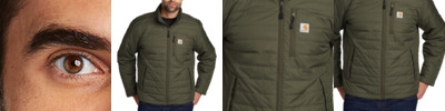 Lightweight, yet warm, this jacket is amazingly durable and dependably water repellent. 1.75-ounce, 100% nylon Cordura ® shell Rain Defender ® durable water repellent Wind Fighter ® technology tames wind Nylon lining quilted to 100-gram, 100% polyester insulation for warmth Reverse coil center front zipper Zip-through collar Left chest map pocket with reverse coil zipper Two hand pockets with hidden snap closures Two interior pockets: one zippered, one hook and loop closure Hook and loop adjustable cuffs Drawcord adjustable drop tail hem Carhartt-strong, triple-stitched main seams Carhartt label sewn on chest pocket Carhartt Warmth Rating Earned: Level 2â¿¿Warmer Relaxed fit