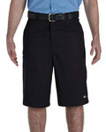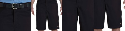 65% polyester, 35% cotton; 13" inseam, permanent crease and loose fit, flat-front; Multi-use pocket on right side panel; Scotchgard™ stain-release finish; Two front and two back pockets; Belt loops, zip-fly with metal hook and bar closure; Dickies logo at lower left front;