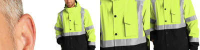 This warm performance soft shell combines superior weather protection with the highest class of visibility. 100% polyester woven shell with durable water-repellent (DWR) finish bonded to a water-resistant, breathable film insert and a 100% polyester microfleece lining Black bottom front and lower sleeves for a cleaner appearance Fabric waterproof rating: 5000MM Fabric breathability rating: 5000G/M2 Full-length interior storm flap with chin guard Durable, reflective 2-inch tape meets ANSI 107 requirements and provides 360-degree visibility on body and sleeves; tape is bonded to fabric Molded right chest, hand and center front zippers with rubber pulls Mic clips at shoulders Elastic cuffs with adjustable hook and loop closures and rubber tabs Adjustable drawcord hem This garment must be fully zipped to be in compliance with ANSI 107 standards