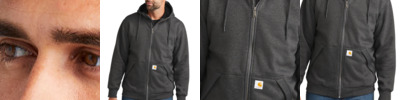 This rain-blocking hoodie is work-ready. 10.5-ounce, 50/50 cotton/poly blend or 59/41 cotton/poly blend with Rain Defender durable water-repellent finish (Black, Carbon Heather, New Navy)* 100% polyester thermal lining retains warmth Attached thermal-lined three-piece hood with drawcord closure Full-length brass front zipper Two front hand warmer pockets with flaps for added security Stretchable, spandex-reinforced, rib knit cuffs and waistband Interior pocket with zipper closure Hidden media pocket Locker loop Carhartt label sewn on left hand warmer pocket Loose fit *Please note: Select colors in Carhartt fleece are currently transitioning from a 50/50 cotton/poly blend to a 59/41 cotton/poly blend. Weight and fabric properties remain the same. Your order may contain a combination of both fabrics.