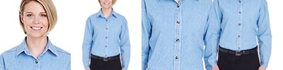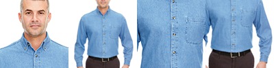 6.5 oz., 100% cotton denim; Double-needle stitching throughout; Spread collar; Wood-tone buttons; Garment washed for extra softness; Subtle shade variances are a natural part of the washing process;