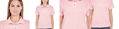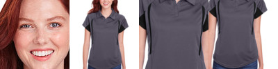 4 oz., 100% polyester mesh; Moisture-wicking; Pill-resistant; UPF 40+ protection; Feminine silhouette; Contrast tipping on knit collar; 3-button placket; Contrast side panels;