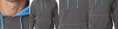 8.5 oz. 60% cotton, 40% polyester fleece; Triple-needle contrast accent stitching; Contrast jersey hood lining and drawcord; Raglan sleeves; Front pouch pocket;