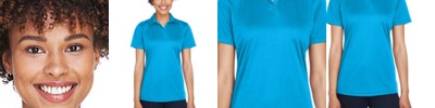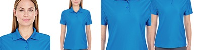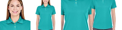 4.8 oz., 100% micro-textured polyester knit; Anti-bacterial; Moisture-wicking; Feminine fit; Flat-knit collar; 3-button placket; Hemmed sleeves; Matching shoulder panels; Side vents; Tagless;