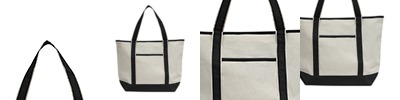 12 oz cotton canvas; Interior zippered pocket 6.5" W x 7.25" H; Exterior front pocket 8.5" W x 9" H; 28" handles with 10" drop; 22" x 16" x 6";