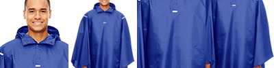 1.5 oz/yd2 / 58 gsm, 100% polyester taffeta with water-resistant finish; Encased elastic at hood opening for superior weather protection; Reflective tape details at front and back shoulders and placket; Two-snap closure at placket with dyed-to-match plastic snaps; Packable into self back pocket with hook and loop closure; Shockcord at lower hem for added weather protection;
