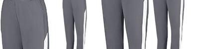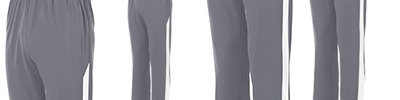Heavyweight 100% polyester matte brushed tricot ; Heat-seal label; Covered elastic waistband with inside drawcord ; Side seam pockets ; Back yoke ; Contrast color side inserts ; Zipper on outside lower leg ; Matching top style 4386;