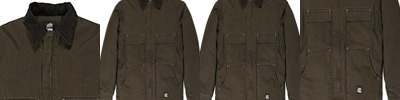 10 oz., heavy-duty cotton duck; Heavyweight quilt-lined taffeta liner; Water-repellent finish; Triple-needle stitched main seam; Heavy-duty brass zipper with storm flap; Collar snaps for optional hood; Two chest pockets with hook/loop closures; Pleated elbows and action back; Knit cuffs and waistband; Manufactured in a LEED (Leadership in Energy and Environmental Design) certified factory;