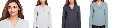 6.6 oz./yd² / 225 gsm, 100% polyester jersey; Snag protection plus; Moisture-wicking; Antimicrobial performance; UV protection; Matching knit collar; Side vents; 4-button placket with dyed-to-match buttons; Narrow placket for femine look; Industrial Laundry Tested to 75 washes; Carbon neutral style in partnership with Green Story third party verified carbon offset program. For more information click on carbon neutral link above MSRP. ;