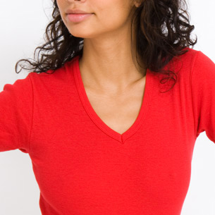 A traditional short-sleeve V-neck constructed of 100% Baby Rib cotton. 100% Baby Rib cotton construction V-neckband Form-fitting Shrinkage: will shrink an average of one size when put in the dryer