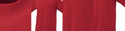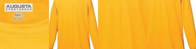 100% polyester wicking knit * Wicks Moisture * Tag-free label * Contrast color neck and sleeves * Raglan sleeves * Fishtail bottom