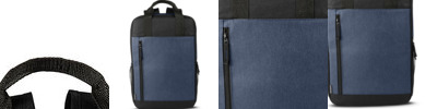 - a two-tone color design with color body and black accent top, front pocket, back panel and handles
