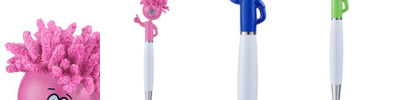 • Click-action ballpoint pen with mop-top hair, and smiley face character making "thumbs up" sign