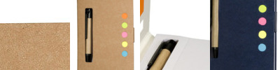 • Includes five assorted neon sticky page flags, a 3" x 4"white perforated 80-sheet pad, and a mini paper barrel ballpoint pen in a recycled cardboard cover