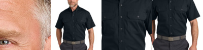 Built from durable ripstop, this rugged shirt looks professional and performs with grit throughout any tough job. 5-ounce, 60/40 polyester/cotton ripstop Stain release Reinforced triple-needle stitching Button-down collar Dyed-to-match buttons Double button-through chest pockets Left pocket pen slot Back pleats Rental-friendly