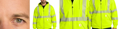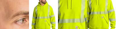 Stay seen and stay dry on the site in this high visibility sweatshirt that meets ANSI/ISEA 107 Class 3 standards. 10.5-ounce, 100% polyester Meets ANSI 107 Class 3, Type R visibility standards 3M Scotchlite reflective material segmented for breathability Rain Defender ® durable water repellent Three-piece adjustable hood Locker loop Hidden media pocket inside right handwarmer pocket Stretchable, spandex-reinforced, rib knit cuffs and waistband Front handwarmer pocket with flaps for security Carhartt label sewn on left handwarmer pocket Reflective material maintains performance through 75 home launderings Loose fit