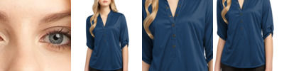 Our feminine, moisture-wicking shirt is an easy moving choice for everyday wear. A fashionable drop shoulder, open Y-neck and roll sleeves with button tabs give this breathable style a modern look. Our finishing wash enhances the softness.