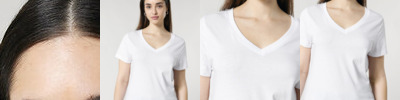 The women’s v-neck t-shirt. Medium fit. Set-in sleeve. 1x1 rib at neck collar. Inside back neck tape in self-fabric. Narrow twin-needle topstitch at sleeve cuff and hem.