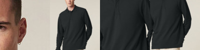 Set-in sleeve. Flat knit rib on the collar. Inside heavy single Jersey back neck tape. Front placket with two buttons in matching body colour. Slit at side seams with heavy single Jersey facing. Single-needle topstitch at shoulder seams. 1x1 rib at sleeve hem. Bottom hem with a narrow double-needle topstitch.