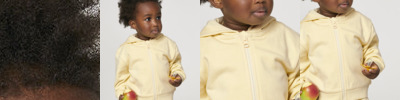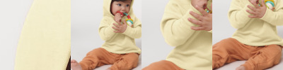 Baby zip-through sweatshirt. Set-in sleeve. Lined hood in single Jersey. Single Jersey tape at inside back neck and at inside of zip. Nylon coil-reversed zip at centre front. Two-sided zip guard at top of zip. Self-fabric half-moon at back neck. 1x1 rib at sleeve hem and bottom hem.