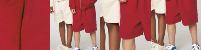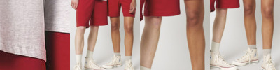 Unisex lightweight shorts. Self-fabric elastic waistband. Hidden flat drawcords on inside waistband. Pockets at front. Patch pocket at back. Bottom hem with narrow double-needle topstitch.