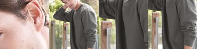 Set-in sleeves. Dropped shoulders. 1x1 ribs at collar, sleeve hems and bottom hem. Two-needle topstitches on all seams. Inside grosgrain back neck tape. Self-fabric half moon at back neck.