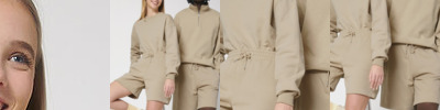 Set-in sleeves. Self-fabric mock neck collar. Quarter-zip at the centre front. 1x1 rib at sleeve cuffs and bottom hem. Double-needle topstitches at the armhole, sleeve cuffs and bottom hem. Herringbone tape at the inside back neck and the inside of the zip. Self-fabric half moon at back neck.