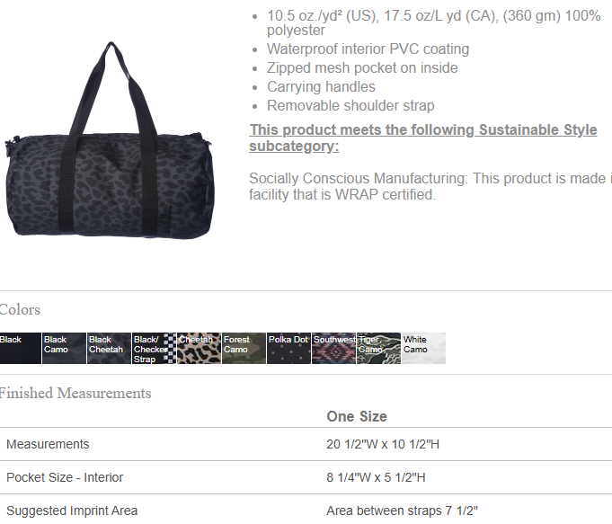 Our 29 Liter Duffel Bag is perfect for everyday use or short trips. Made of durable polyester material with Nylon handles and removable shoulder strap. To the beach, to the gym, away for the weekend, you name it... this is the perfect duffel bag.